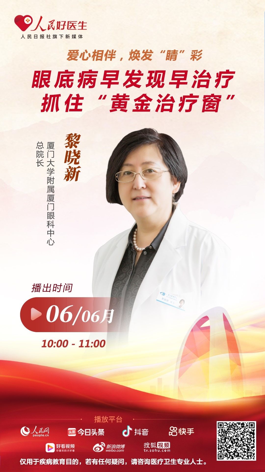 倘若将眼睛比作一部有底片的照相机,那么眼底病就是底片出现了问题,因此无法成像,其危害主要是影响视觉能力,严重的造成失明。眼底病的类型有很多,其中最常见的是老年性黄斑变性、糖尿病视网膜病变、视网膜静脉阻塞、病理性近视等。6月6日10:00,“人民好医生”客户端将邀请到厦门大学附属厦门眼科中心总院长黎晓新教授,给公众科普近常见眼底疾病的相关知识。